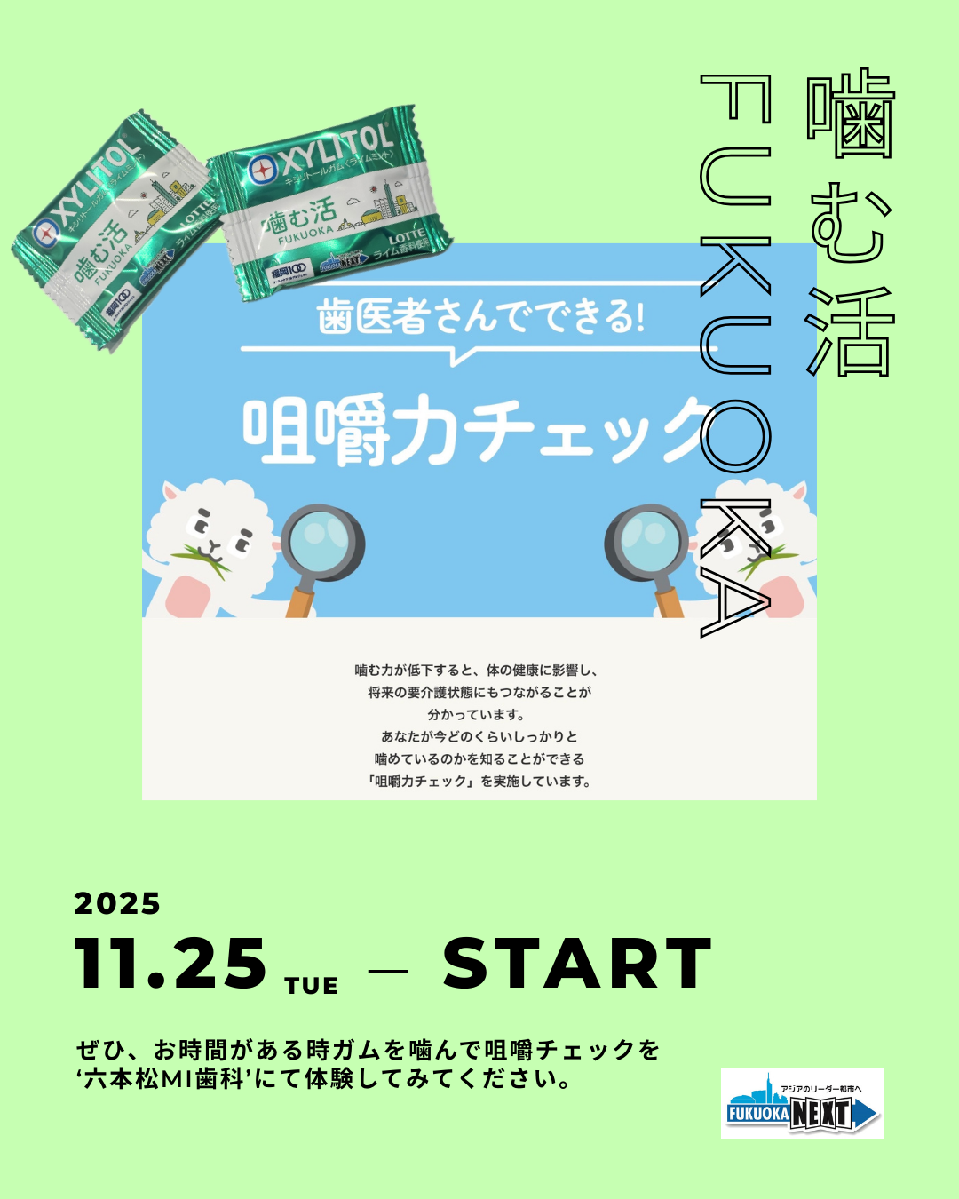 噛むと色が変わるガムを使用して咀嚼力チェックができる企画が、福岡市の対象医院で11月25日から開始されました。