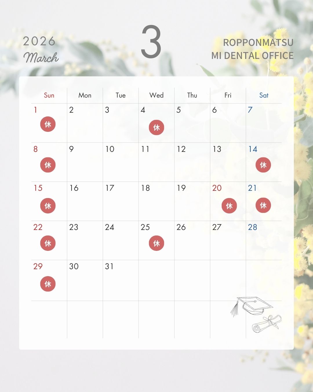 3月14日(土)と3月21日(土)は研修会に参加するため休診日になっております。